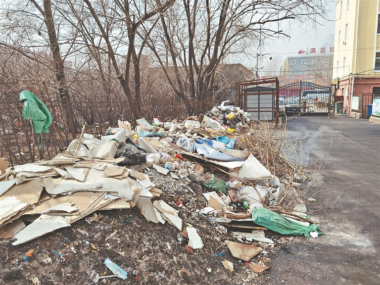 南崗區(qū)學(xué)府路300號(hào)至308號(hào)之間,是一片改造后的老舊小區(qū),一側(cè)大門還有戴紅袖標(biāo)的人員看守。進(jìn)入后,道路一側(cè)出現(xiàn)了垃圾帶,生活垃圾、裝修垃圾、放棄雜物和殘冰殘雪,堆出了20米的“長(zhǎng)龍”。據(jù)這里的居民介紹,小區(qū)沒(méi)有物業(yè),衛(wèi)生由街道管理?!坝捎陂L(zhǎng)期不外運(yùn),天熱的時(shí)候,這里的垃圾會(huì)很臭。其實(shí)小區(qū)環(huán)境還不錯(cuò),就是缺少管理?!?/span>