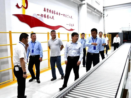 圖為李軍一行考察自動(dòng)傳輸集貨作業(yè)現(xiàn)場(chǎng)