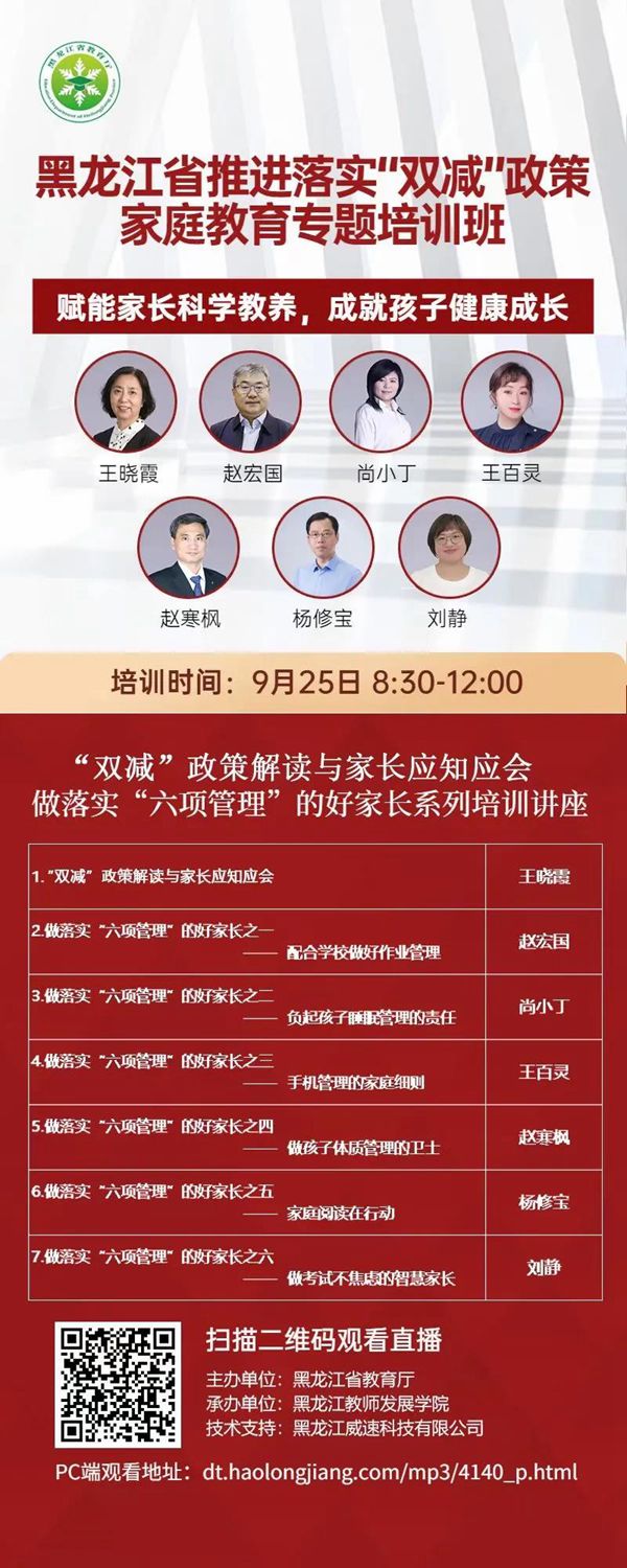 據(jù)了解,此次培訓(xùn)是《黑龍江省中小學(xué)“百萬(wàn)家庭賦能”工程實(shí)施方案》重要組成部分,也是省教育廳踐行黨史學(xué)習(xí)教育“我為群眾辦實(shí)事”,解決群眾急難愁盼問(wèn)題的具體舉措,由省教育廳主辦、黑龍江教師發(fā)展學(xué)院承辦,基礎(chǔ)教育處處長(zhǎng)領(lǐng)銜六位家庭教育專家共同開(kāi)講,時(shí)長(zhǎng)三個(gè)半小時(shí),受到廣大家長(zhǎng)的一致好評(píng),取得良好的社會(huì)反響,直播時(shí)瀏覽峰值達(dá)到210.7萬(wàn)人次。培訓(xùn)內(nèi)容緊緊圍繞廣大家長(zhǎng)們“雙減”形勢(shì)下的困惑,深入宣傳“雙減”政策和年初以來(lái)教育部相繼下發(fā)的關(guān)于手機(jī)、作業(yè)、睡眠、讀物、體質(zhì)、考試等“六項(xiàng)管理”文件內(nèi)容,分七個(gè)專題進(jìn)行深入細(xì)致的家庭教育指導(dǎo),有的放矢地解答家長(zhǎng)“心中所疑”、化解家長(zhǎng)“心中所急”,很多家長(zhǎng)通過(guò)家庭學(xué)校群進(jìn)行交流,有的家長(zhǎng)反饋道:“通過(guò)觀看直播我們家長(zhǎng)深刻體會(huì)到一定要以身作則,在孩子面前少玩手機(jī),多陪孩子閱讀書籍,多讓孩子進(jìn)行戶外活動(dòng)?!庇械募议L(zhǎng)則表示,聽(tīng)了講座深刻理解了孩子成長(zhǎng)的根基深植于家庭教育的道理,家庭教育才是孩子的起跑線,主動(dòng)地配合學(xué)校落實(shí)“雙減”政策,從做好“六項(xiàng)管理”入手科學(xué)優(yōu)化家庭教養(yǎng)方式,減少孩子的校外培訓(xùn)和作業(yè)負(fù)擔(dān),還給孩子一個(gè)幸福的童年,做一名智慧家長(zhǎng)。