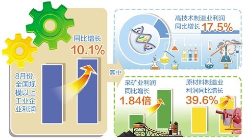8月份,采礦業(yè)、原材料制造業(yè)利潤同比分別增長1.84倍、39.6%,均明顯高于規(guī)模以上工業(yè)平均水平;兩年平均分別增長58.1%、36.0%,增速較上月分別加快24.0個和4.4個百分點(diǎn)。其中,受大宗商品價格總體高位運(yùn)行推動,煤炭行業(yè)利潤同比增長2.41倍,增速較上月加快30.0個百分點(diǎn);油氣開采行業(yè)利潤同比增長2.57倍;有色、化工行業(yè)利潤分別增長98.9%、66.5%。