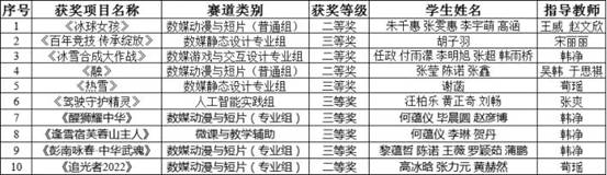 在參賽學(xué)生與指導(dǎo)教師的共同努力下,10項(xiàng)作品進(jìn)入國賽(包括大數(shù)據(jù)應(yīng)用組、人工智能實(shí)踐組、數(shù)媒動(dòng)漫與短片組、數(shù)媒靜態(tài)設(shè)計(jì)專業(yè)組、微課與教學(xué)輔助組、數(shù)媒游戲與交互設(shè)計(jì)組),最終喜獲全國二等獎(jiǎng)4項(xiàng),全國三等獎(jiǎng)6項(xiàng)。