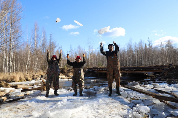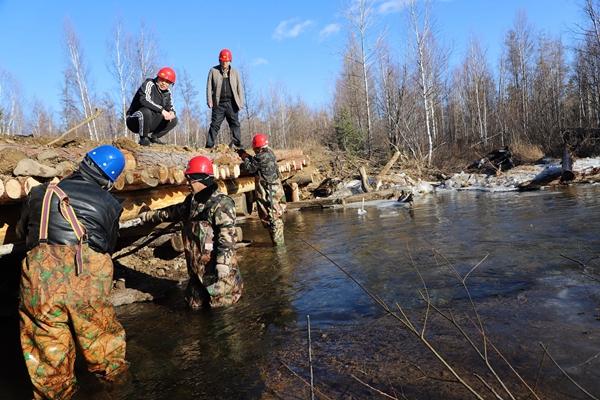 阿木爾林業(yè)局多種經(jīng)營公司職工涉水檢查新建橋梁安全系數(shù)。