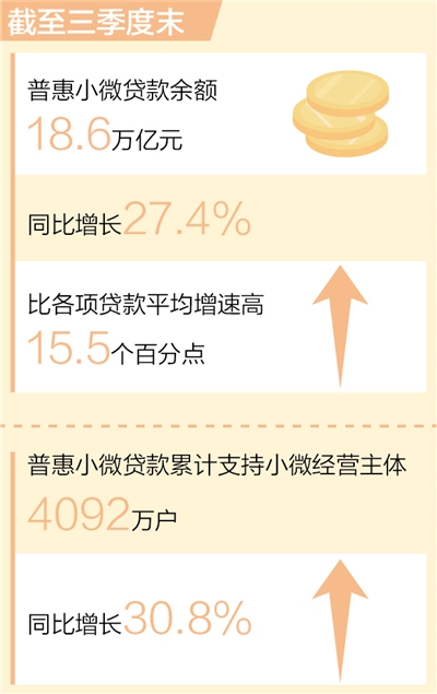 中國人民銀行發(fā)布的最新數(shù)據(jù)顯示,截至三季度末,我國普惠小微貸款余額18.6萬億元,同比增長27.4%,比各項(xiàng)貸款平均增速高15.5個(gè)百分點(diǎn)。普惠小微貸款維持較高的增長態(tài)勢,繼續(xù)保持量增、面擴(kuò)、價(jià)降、結(jié)構(gòu)優(yōu)化的特點(diǎn)。