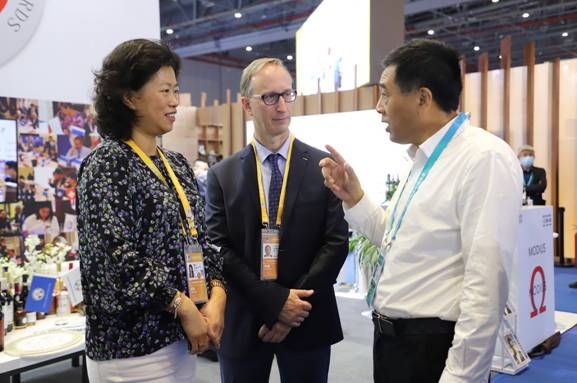 李軍、陳昱兩位集團(tuán)公司領(lǐng)導(dǎo)走進(jìn)北極冰藍(lán)莓酒莊設(shè)立在法國FIWA的站臺(tái),向FIWA國際大獎(jiǎng)賽主席、法國國際品評鑒定酒類專家協(xié)會(huì)主席奧利維耶·布什,以及法國FIWA SAS股份有限公司總裁張莉推介了參展的藍(lán)莓冰酒、藍(lán)莓雪酒等產(chǎn)品在剛剛結(jié)束的義烏森博會(huì)受到客戶青睞情況,尤其是重點(diǎn)介紹了大興安嶺地處祖國最北方,日照時(shí)間長,晝夜溫差大,天然純降水,生長出野生藍(lán)莓具有花青素含量高的特點(diǎn),其產(chǎn)品藍(lán)莓冰酒、藍(lán)莓白蘭地等在法國國際葡萄酒大獎(jiǎng)賽、有機(jī)葡萄酒大獎(jiǎng)賽和烈酒大獎(jiǎng)賽上斬獲大金獎(jiǎng)、金獎(jiǎng)。
