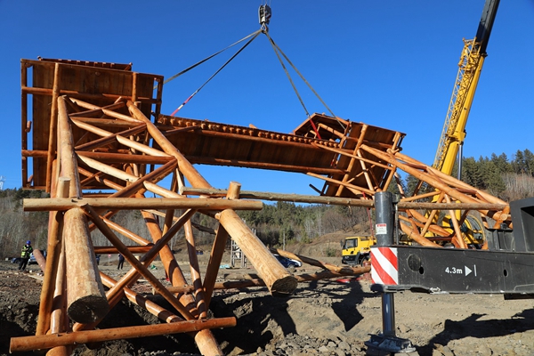 阿木爾林業(yè)局薩布素景區(qū)的薩布素軍馬場(chǎng)大門(mén)被緩緩起吊起來(lái)(王力/攝)