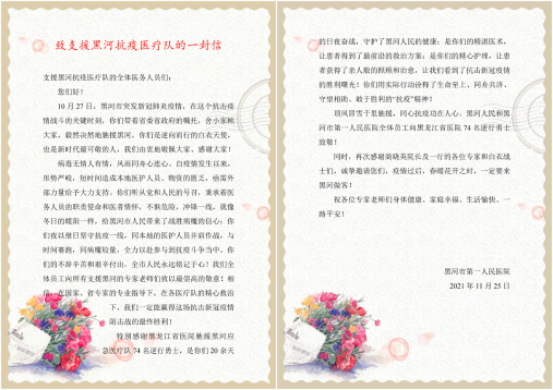 醫(yī)療隊抵達黑河后即迅速成立了臨時黨支部,由總指揮商曉英副院長擔任支部書記,充分發(fā)揮基礎(chǔ)黨組織戰(zhàn)斗堡壘作用,堅守初心、踐行使命,加強抗疫一線黨的建設,團結(jié)帶領(lǐng)了所有黨員及全體群眾,對黨忠誠、勇于擔當、頑強堅守。期間,得到了省衛(wèi)健委、黑河市委市政府、黑河抗疫指揮部等各級領(lǐng)導的關(guān)懷、認可和鼓勵,也得到了國家、省級專家組的科學指導和一致好評。醫(yī)療隊精湛的救治水平、無微不至的服務關(guān)懷更是得到了每一位患者的點贊。
