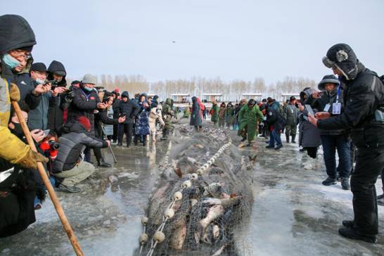 另外,杜爾伯特連環(huán)湖水產(chǎn)資源豐富,水產(chǎn)養(yǎng)殖業(yè)水域面積56萬多畝,湖內(nèi)盛產(chǎn)40種淡水魚類,尤以鯉魚、草魚、鰱魚、胖頭魚、鯽魚、黑魚等為多,年捕魚千余噸,冬網(wǎng)捕魚更是傳統(tǒng)習(xí)俗。連環(huán)湖溫泉景區(qū)冬季每天上午免費開展民俗冬捕活動,購魚享受8折優(yōu)惠,還可以參與抽獎活動。