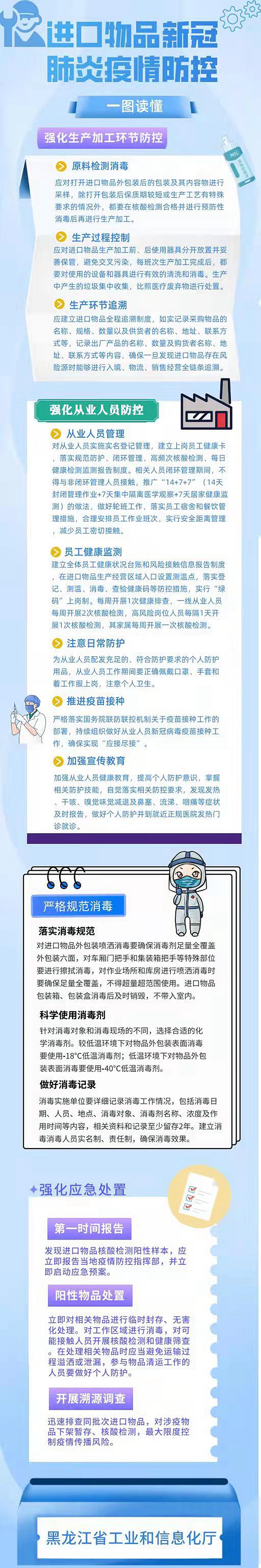公開信表示,近期疫情反彈形勢嚴峻復雜,為確保工業(yè)企業(yè)不發(fā)生聚集性疫情,共同構(gòu)筑疫情防控堅固防線,提示:涉及進口物品加工、使用的工業(yè)企業(yè)要嚴格按照《黑龍江省進口物品新冠肺炎疫情風險防控工作方案》落實各項防疫措施。一要強化生產(chǎn)加工環(huán)節(jié)的防控。生產(chǎn)前做好原料檢測消毒,生產(chǎn)中做好過程控制,設(shè)備和器具進行有效的清洗和消毒避免交叉污染,產(chǎn)生的垃圾集中收集,比照醫(yī)療廢棄物進行處置。建立進口物品全程追溯制度,確保一旦發(fā)現(xiàn)進口物品存在風險源時能夠進行入境、物流、銷售經(jīng)營全鏈條追溯。二要強化從業(yè)人員防控。對員工實施實名登記管理,做好員工健康監(jiān)測和核酸檢測,合理安排作業(yè)班次,減少密切接觸。配發(fā)充足并符合防護要求的個人防護用品,加強員工健康教育,提高個人防護意識。嚴格落實當?shù)仃P(guān)于疫苗接種工作的部署,持續(xù)組織做好員工新冠病毒疫苗接種工作,確保實現(xiàn)“應接盡接”。三要嚴格規(guī)范消毒。對進口物品外包裝、加工場所、車廂門把手和集裝箱把手等要嚴格按照規(guī)范消毒,消毒時要確保足量全覆蓋并針對消毒對象和消毒現(xiàn)場的不同選擇合適的化學消毒劑。詳細記錄消毒工作情況,建立消毒人員實名制、責任制,確保消毒效果。四要強化應急處置。發(fā)現(xiàn)進口物品核酸監(jiān)測陽性樣本,應立即報告當?shù)匾咔榉揽刂笓]部,并同步啟動應急預案。對相關(guān)物品進行臨時封存、無害化處理,對工作區(qū)域進行消毒,對可能接觸的人員開展核酸檢測和健康篩查。迅速排查同批次進口物品,最大限度控制疫情傳播風險。