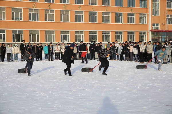 組織開(kāi)展拉輪胎跑比賽。拉輪胎跑比賽在各年級(jí)間進(jìn)行,每班6名選手,50米往返,以時(shí)間少者為勝。隨著裁判老師一聲令下,比賽開(kāi)始,選手們立馬拉起了輪胎奮力向前沖刺,克服雪地不利的條件,參賽選手飛快地向終點(diǎn)奔跑,掌聲、加油聲響徹操場(chǎng)。冬日的操場(chǎng)上,一個(gè)個(gè)運(yùn)動(dòng)的身影,綻放著最美的光華。