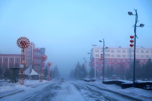 早晨7點30分,阿木爾林業(yè)局天剛蒙蒙亮,遠(yuǎn)處的群山不見了蹤影,籠罩在寒霧當(dāng)中,附近的建筑物影影綽綽,仿佛仙境一般,這種寒霧天氣被百姓成為“冒白煙”。