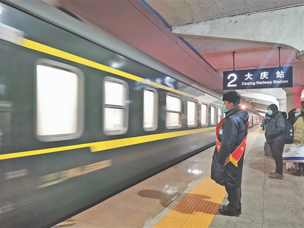 由于節(jié)后返程客流劇增,大慶地區(qū)去往海拉爾的4趟旅客列車無法滿足企業(yè)返崗需要,為幫助企業(yè)解決油田職工返崗復(fù)工困難,哈爾濱局集團公司全力協(xié)助大慶油田有限責(zé)任公司辦理職工出行事宜,為企業(yè)量身定制了油田職工返崗復(fù)工專列開行方案。在春運期間運力緊張的情況下,專門調(diào)集10輛空調(diào)車體,全面進行設(shè)備檢修維護和車輛消毒作業(yè),滿足石油工人出行需求。負責(zé)運輸組織工作的大慶站為油田職工提供專項聯(lián)絡(luò)、專區(qū)候車、專人引導(dǎo)服務(wù),及時辦理團體購票,增開進站通道,提前做好候車區(qū)域通風(fēng)、消毒和保潔工作,配合地方政府嚴格落實進站掃碼、測溫等防疫措施,在驗票進站、安檢、候車、乘車等環(huán)節(jié)設(shè)置人員進行引導(dǎo)。并利用小喇叭、電子顯示屏、車站廣播等載體,循環(huán)播放疫情防控措施、登乘列車注意事項,引導(dǎo)務(wù)工人員分散候車就座。鐵路部門精心抽調(diào)服務(wù)經(jīng)驗豐富的哈爾濱客運段北京車隊列車工作人員負責(zé)乘務(wù)工作,提前做好列車通風(fēng)消毒和防疫保潔工作,為乘客準備了一次性醫(yī)用口罩和消毒洗手液,全力營造健康安全的出行環(huán)境。