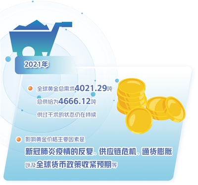 方正中期期貨有限公司貴金屬研究員史家亮認為,2021年,全球黃金總需求4021.29噸,總供給為4666.12噸,供過于求的狀態(tài)仍在持續(xù)。不過,黃金價格并沒有持續(xù)大幅回落,主因在于黃金的商品屬性對價格的影響仍在弱化,黃金的債券屬性和貨幣屬性是黃金價格走勢的核心影響因素,而這又與美聯(lián)儲貨幣政策走勢密切相關。