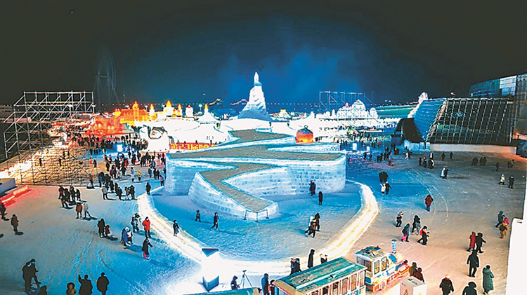 哈爾濱冰雪大世界“冬夢飛揚(yáng)”以北京冬奧會會徽“冬夢”為靈感來源。