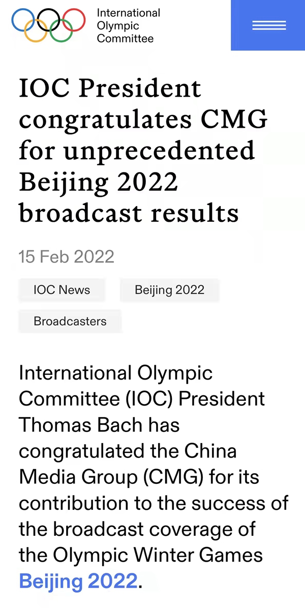 據(jù)國際奧委會官方網站2月15日消息:國際奧委會主席托馬斯·巴赫對中央廣播電視總臺為成功轉播報道2022年北京冬奧會所做出的貢獻表示祝賀。