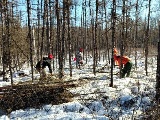 圖強(qiáng)林業(yè)局營(yíng)林工人們?cè)诹珠g清理撫育枝丫(趙明 攝)