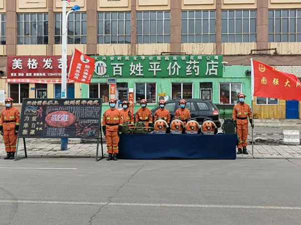 圖強林業(yè)局設(shè)立定點宣傳臺,通過展板和森林防滅火裝備向群眾普及森林防火常識(趙明 攝)