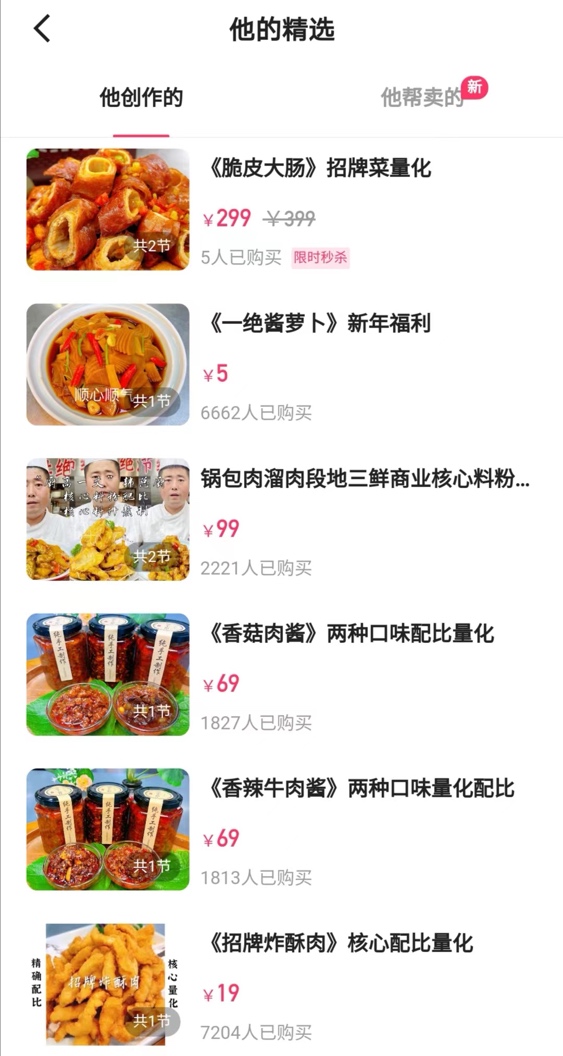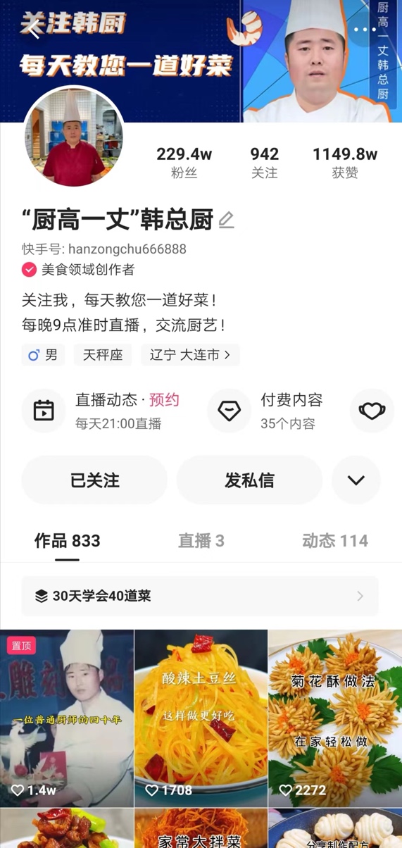 作為一位有著25年美食領(lǐng)域從業(yè)經(jīng)驗(yàn)的老廚師,韓總廚憑借一手精湛的廚藝,來到快手后很快就積累了上萬粉絲,為他打造付費(fèi)課程奠定了基礎(chǔ)?!皩Ρ攘似渌_(dá)人的內(nèi)容,我覺得自己還是有一定的內(nèi)容優(yōu)勢的,所以也試著做了課程,看看是否有人愿意購買?!?