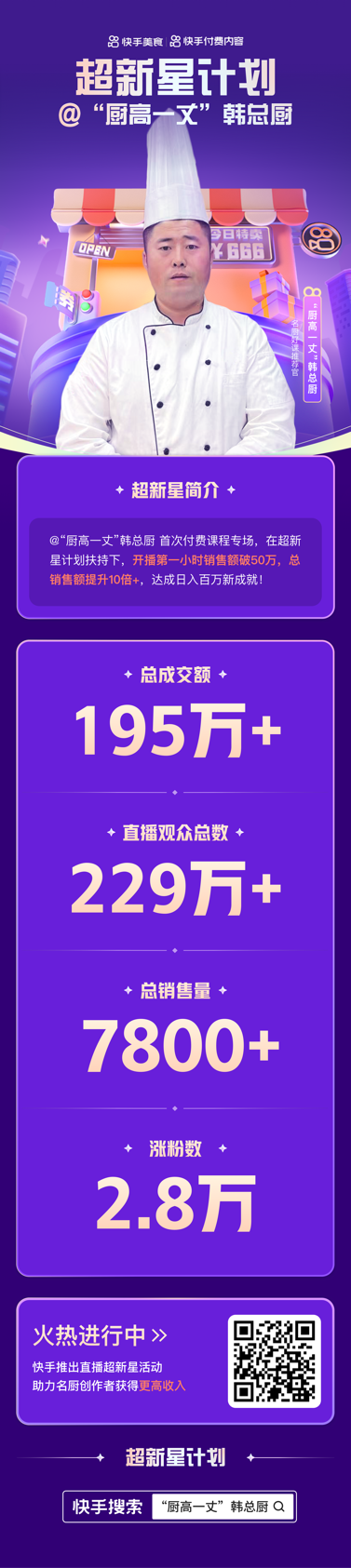 前不久,快手美食主播“廚高一丈韓總廚”(快手ID:hanzhongchu666888)參加了快手官方舉辦的“超新星計(jì)劃”,開啟付費(fèi)課程直播專場,最終取得總成交額195萬+,總銷售量7800+的亮眼成績。