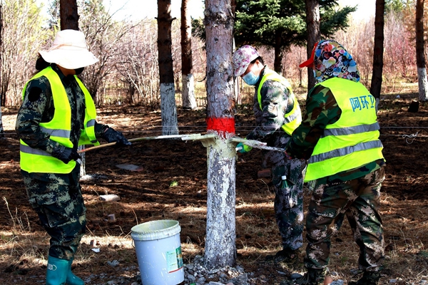 阿木爾林業(yè)局環(huán)衛(wèi)工為道路兩側(cè)綠化樹木涂抹防啃劑,保護生態(tài),美化環(huán)境(王力 攝)