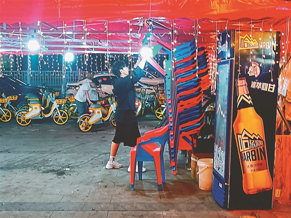 夜幕降臨,冰城街路的大排檔里,人們一邊吃著燒烤海鮮,一邊喝著啤酒,談天說地,不亦樂乎……仲夏六月,在大排檔允許外擺政策的推動下,夏日“夜經(jīng)濟”越來越火熱,冰城濃濃的“煙火氣”回歸。大排檔既豐富了市民生活,冰城的快樂消費也開始了。