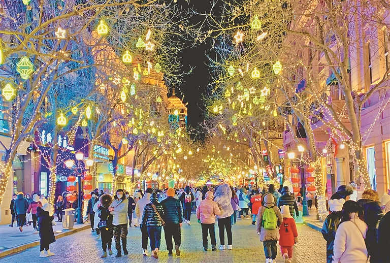穿過(guò)歐式建筑,滿滿冰城風(fēng)情的彩燈以及年味十足的大紅燈籠將哈爾濱中央大街點(diǎn)亮。2023年新年伊始,百年老街呈現(xiàn)出游人如織的火熱場(chǎng)面,熟悉又熱鬧的氣氛彌漫在老街的各個(gè)角落,煙火氣持續(xù)升騰。欣賞唯美的陽(yáng)臺(tái)音樂秀,品嘗鍋包肉、馬迭爾冰棍等特色美食,打卡“星空燈”、“雪妮妮網(wǎng)紅兔子”雪雕……游客和市民沉浸在一個(gè)個(gè)融合創(chuàng)意與冰城特色的冰雪玩法和體驗(yàn)之中,盡情享受冰雪帶來(lái)的歡樂。數(shù)據(jù)顯示,僅春節(jié)期間,中央大街日均客流量維持在40萬(wàn)人次,高峰時(shí)期達(dá)到70余萬(wàn)人次。