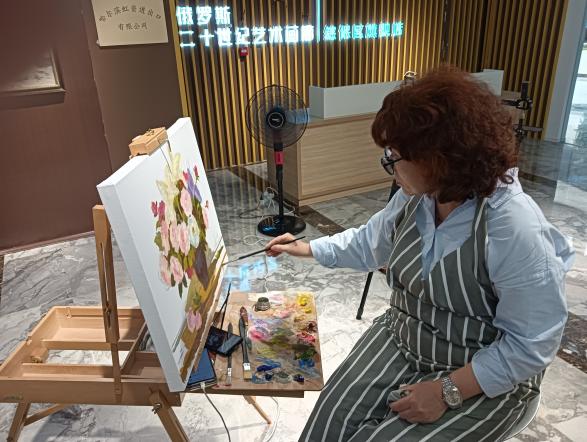 活動期間,柯切爾金娜·伊麗娜到哈爾濱綜合保稅區(qū)參觀俄羅斯文化展示館(俄中藝術(shù)線下商城體驗店No.1),與哈爾濱綜合保稅區(qū)領(lǐng)導(dǎo)就中俄優(yōu)秀傳統(tǒng)文化進行了友好交流,并即興在展館內(nèi)現(xiàn)場作畫。伊麗娜以繪畫花卉靜物著名,曾榮獲俄羅斯文化部獎狀、俄羅斯文化部榮譽證書、俄羅斯美協(xié)銀質(zhì)獎?wù)隆?