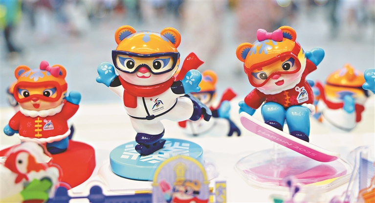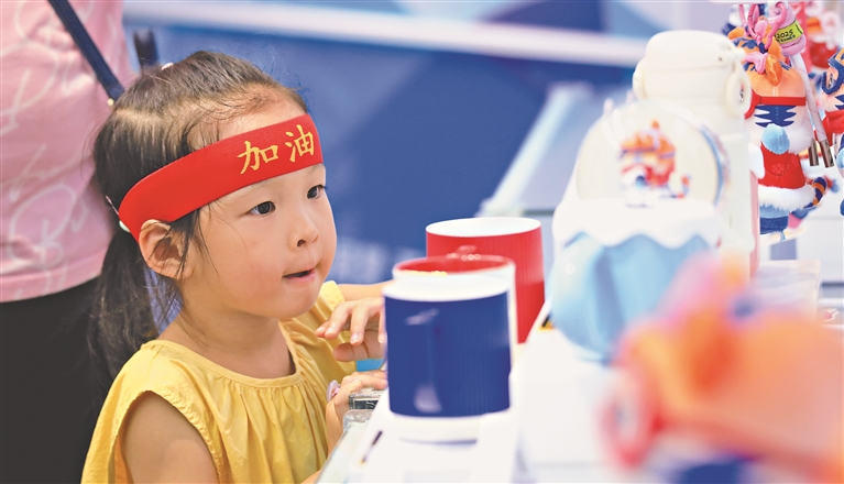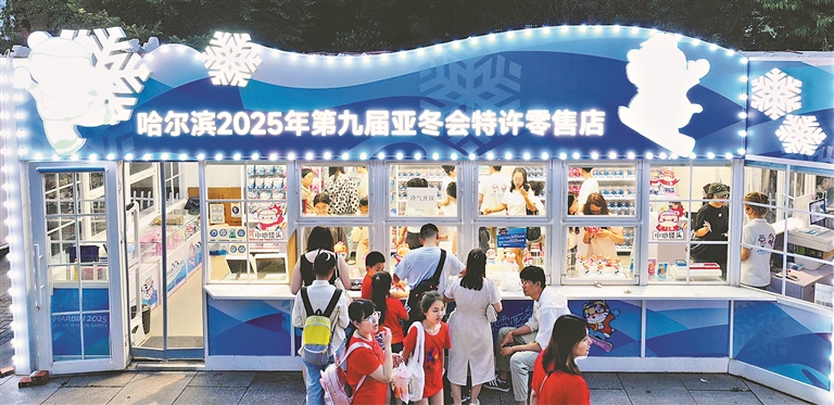 6月29日,第九屆亞冬會特許零售店哈爾濱索菲亞教堂店,游客在琳瑯滿目的貨品中挑選心儀的款式。