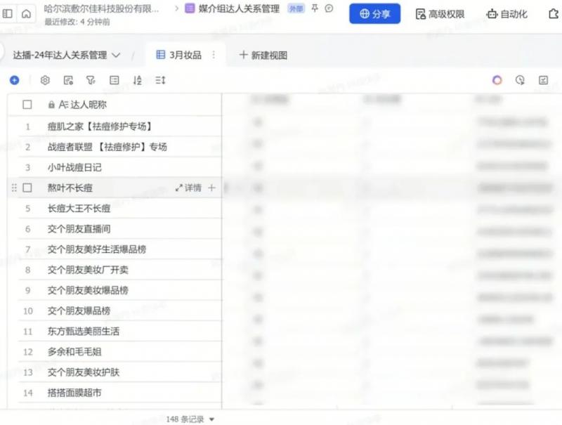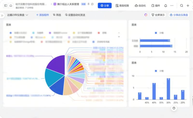 由于器械字號(hào)產(chǎn)品的特殊性,現(xiàn)在敷爾佳通過(guò)飛書在線文檔審批達(dá)人,將達(dá)人數(shù)據(jù)填寫上報(bào),上級(jí)在線同步審批達(dá)人,跟進(jìn)確定合作。直播中,用飛書云盤儲(chǔ)存資料,將達(dá)播錄屏,產(chǎn)品資料等數(shù)據(jù),同步云盤,方便各部門查看,調(diào)取相關(guān)資料。直播后,利用飛書多維表格將達(dá)人信息,合作傭金,產(chǎn)出 GMV,對(duì)接人等重要信息歸攏一起,形成多維表格方便組織內(nèi)互相查閱填寫, 通過(guò)儀表盤的功能體現(xiàn)出哪些達(dá)人是優(yōu)質(zhì)合作達(dá)人,并為二次投放合作提供了參考價(jià)值。