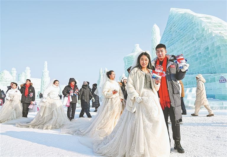 婚典儀式結束后,新人們乘坐哈爾濱冰雪大世界雪花摩天輪,俯瞰壯美的北國風光,和游人一起賞冰玩雪、拍照留念。在太陽島雪博會,新人們欣賞雪雕藝術之美,在憨態(tài)可掬的《雪人先生》、氣勢磅礴的主塑《雪艷春》等雪雕前拍照留念,體驗“走著走著就一起白頭”的人工降雪浪漫場景,在潔白冰雪筑起的美輪美奐童話世界中,感受哈爾濱冰雪文化的浪漫氛圍。