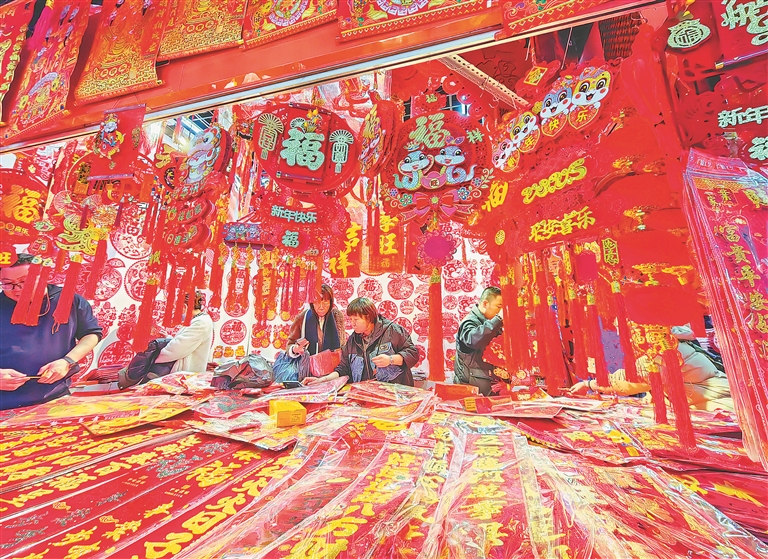 春節(jié)臨近,哈爾濱市道里區(qū)一處批發(fā)市場(chǎng)內(nèi),市民們正在購(gòu)買各種節(jié)日飾品,用來裝點(diǎn)家居,迎接新春佳節(jié)的到來。蛇年主題的燈籠、對(duì)聯(lián)、福字等擺滿了柜臺(tái),紅紅火火,喜慶氣氛濃厚。人們臉上都洋溢著幸福的笑容,一邊逛一邊買,個(gè)個(gè)滿載而歸。