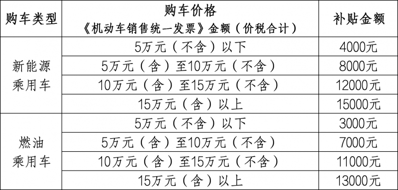 細(xì)則規(guī)定,消費(fèi)者轉(zhuǎn)讓的舊車應(yīng)于2025年1月8日前登記在申請(qǐng)人名下。在購買新車時(shí),按照《機(jī)動(dòng)車銷售統(tǒng)一發(fā)票》金額(價(jià)稅合計(jì)),置換車輛為新能源乘用車新車的:5萬元(不含)以下每輛補(bǔ)貼4000元;5(含)-10萬元(不含)補(bǔ)貼8000元;10(含)-15萬元(不含)補(bǔ)貼12000元;15萬元(含)以上補(bǔ)貼15000元。如置換燃油乘用車:5萬元(不含)以下補(bǔ)貼3000元;5(含)-10萬元(不含)補(bǔ)貼7000元;10(含)-15萬元(不含)補(bǔ)貼 11000元;15萬元(含)以上補(bǔ)貼13000元。補(bǔ)貼資金用完活動(dòng)即止。