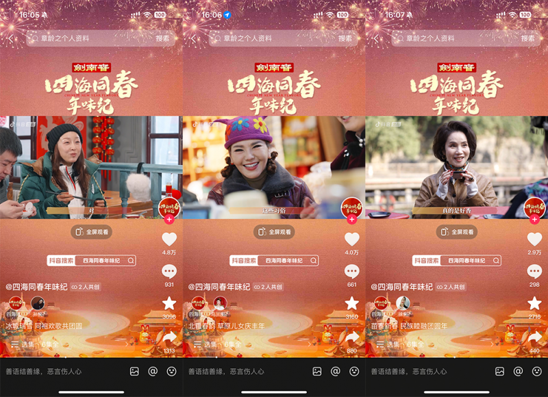為紀念首個“非遺版春節(jié)”,由抖音出品、中國名酒劍南春冠名的春節(jié)主題紀錄片《四海同春年味紀》邀請多位明星來到家鄉(xiāng)或向往的城市,體驗當?shù)靥厣晡丁<o錄片于1月22日-1月27日,通過抖音、抖音精選、今日頭條、西瓜視頻、鮮時光等平臺播出。截至收官,該片正片播放量超1億,抖音話題播放量破2.3億,全網(wǎng)曝光達10億,相關(guān)話題多次登上平臺熱榜。