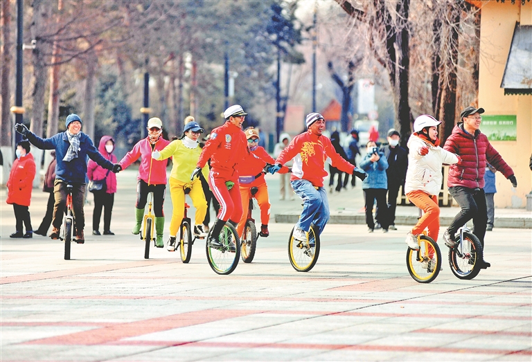 在哈爾濱市江畔斯大林公園內(nèi)的小廣場上,許多人在練習騎獨輪車。在樹林旁,數(shù)十位老年人在跳民族舞。公園的人行道上,不時有成群的徒步者走過。