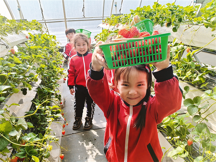 在位于陽(yáng)明區(qū)樺林鎮(zhèn)的唐櫻園生態(tài)農(nóng)場(chǎng)里,整齊排列著24棟智能溫室大棚。在11號(hào)草莓大棚里,來(lái)自同心幼兒園的小朋友正在采摘草莓,孩子們興奮地圍著草莓觀察,“草莓真好看,草莓好甜??!”