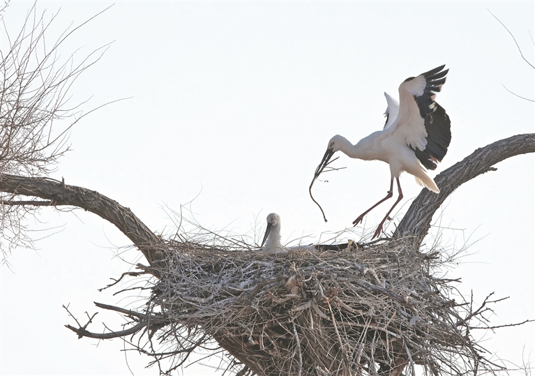 圖為東方白鸛筑巢孵卵。本報(bào)記者 郭俊峰攝
