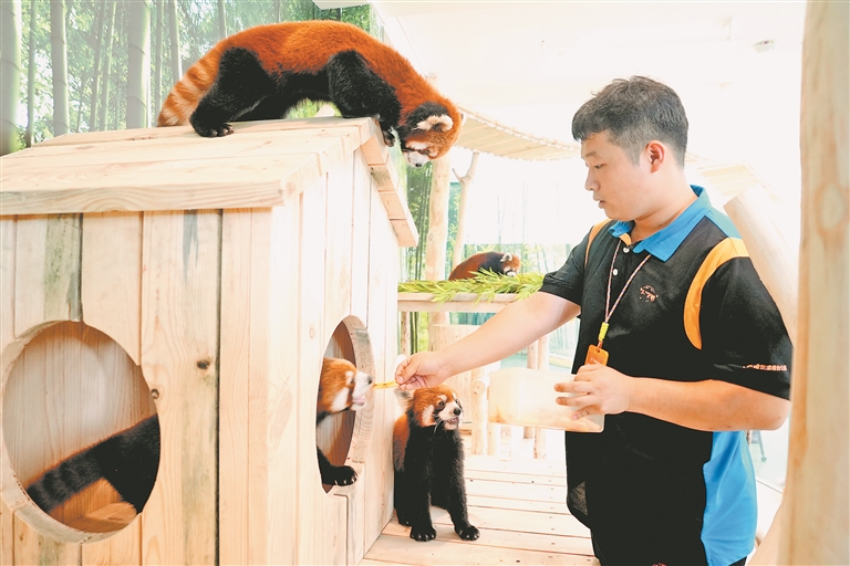 小熊貓是國家二級保護(hù)動物,野外種群數(shù)量不足萬只。保育員團(tuán)隊(duì)精心準(zhǔn)備小熊貓的飲食,專門從四川空運(yùn)新鮮竹子并搭配多種營養(yǎng)餐食,確保小熊貓們健康成長。本報(bào)記者 董廣碩攝