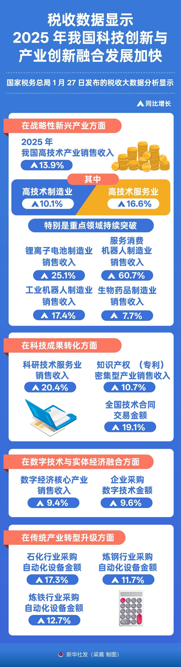 新華社北京1月27日電(記者劉開(kāi)雄)國(guó)家稅務(wù)總局1月27日發(fā)布的稅收大數(shù)據(jù)分析顯示,2025年,我國(guó)科技創(chuàng)新與產(chǎn)業(yè)創(chuàng)新融合發(fā)展加快,戰(zhàn)略性新興產(chǎn)業(yè)茁壯成長(zhǎng),科技成果轉(zhuǎn)化力度持續(xù)提升,數(shù)字技術(shù)與實(shí)體經(jīng)濟(jì)融合加深,傳統(tǒng)產(chǎn)業(yè)轉(zhuǎn)型升級(jí)加快。