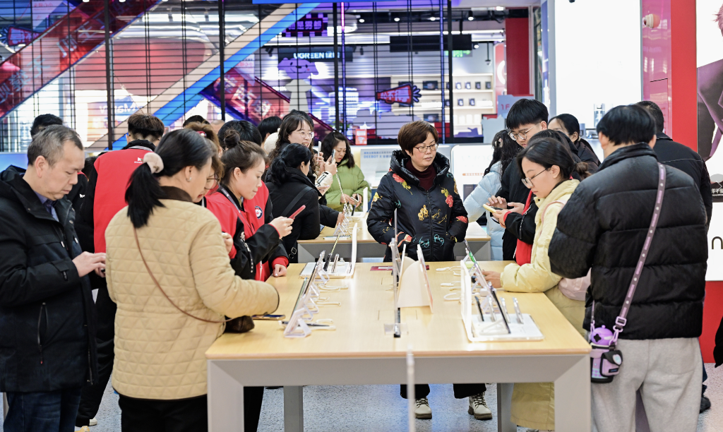 ??2026年“新國補(bǔ)”落地,消費(fèi)者在重慶京東MALL選購手機(jī)。(受訪者供圖)