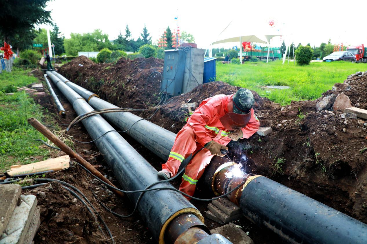 阿木爾林業(yè)局專業(yè)技術(shù)工人在鋪設(shè)供暖主管線,解決林海街平房用戶不熱問題(王力 攝)