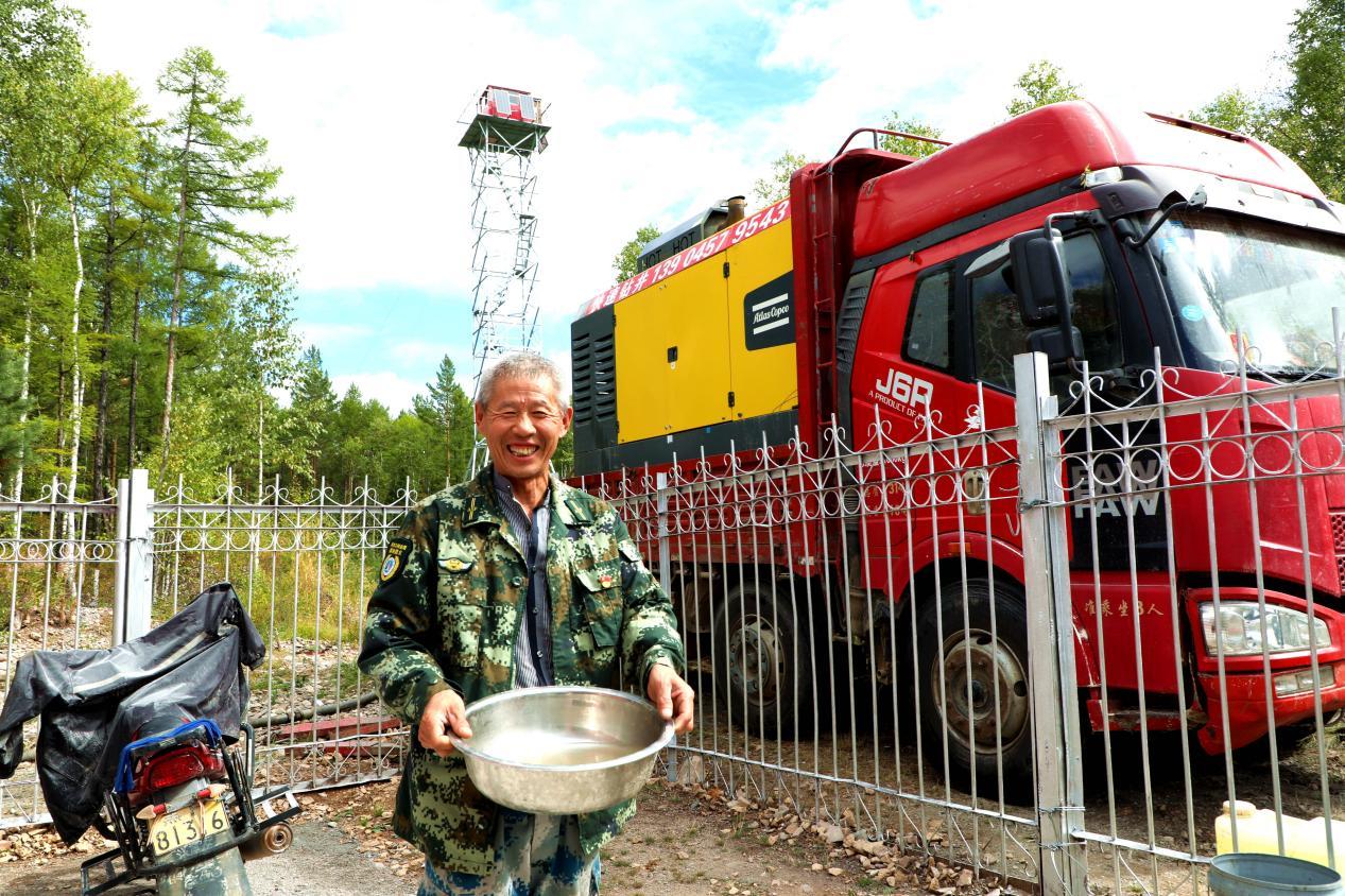 “阿06”防火瞭望塔瞭望員樊學(xué)春端著剛打出來的水,笑得合不攏嘴(王力 攝)