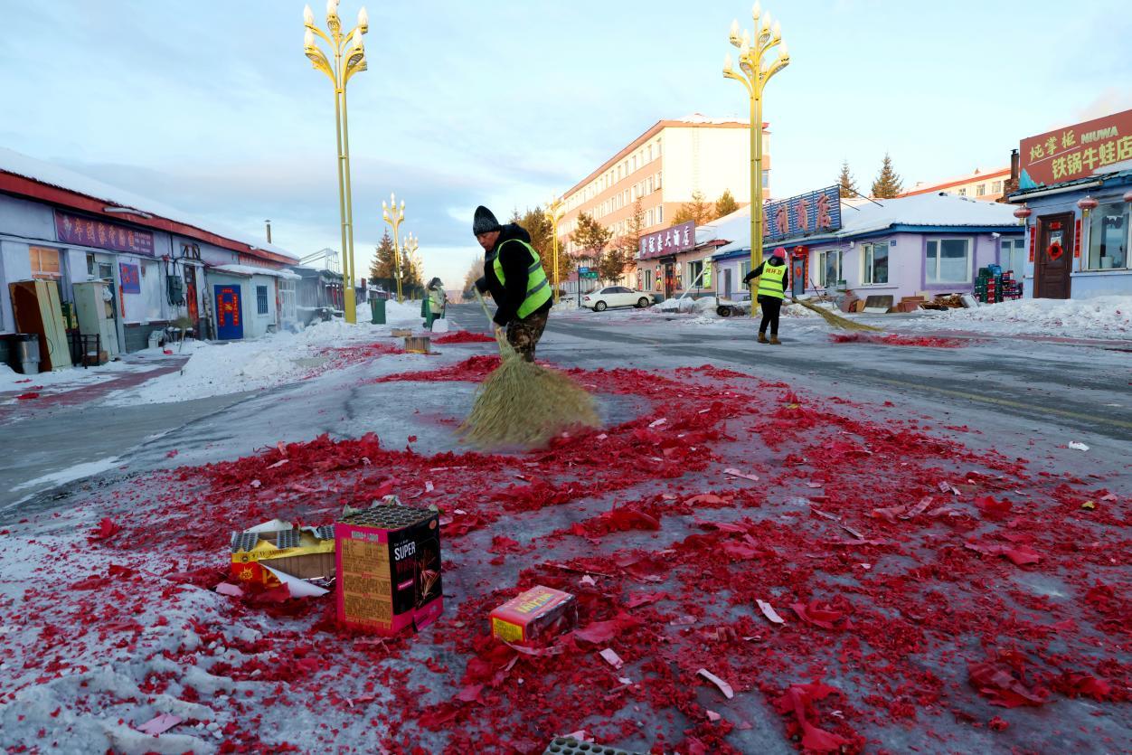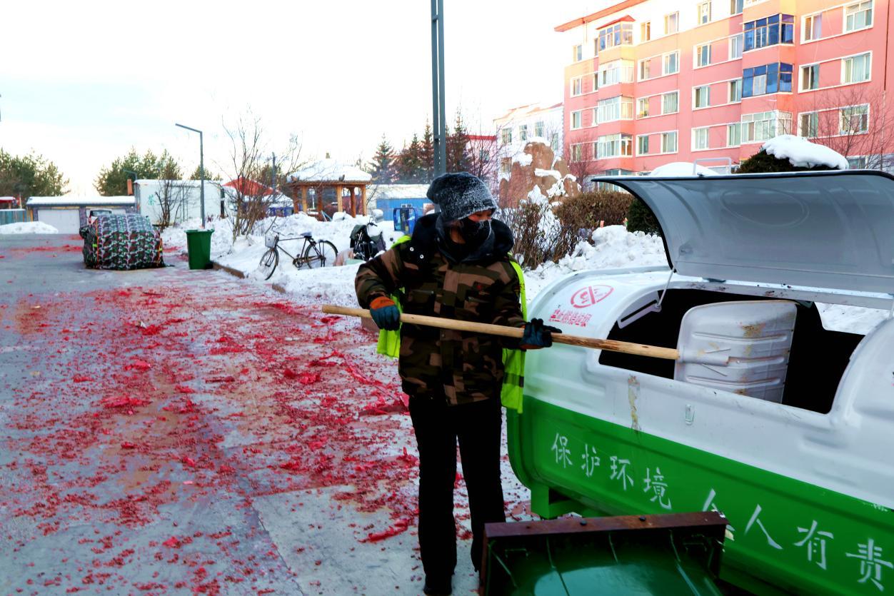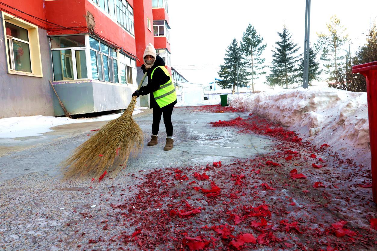 2月16日8點(diǎn),大街小巷年味正濃,鞭炮紙屑散落各處,行人寥寥。身穿黃馬甲的林業(yè)局環(huán)衛(wèi)工人已穿梭在街頭,帽子、睫毛凝滿白霜,手中掃帚不停揮舞,將鞭炮碎屑、生活垃圾及時(shí)清掃歸堆、裝車清運(yùn)。轉(zhuǎn)崗環(huán)衛(wèi)工人馬建民說(shuō):“我的責(zé)任區(qū)內(nèi)商戶多、居民多,春節(jié)期間工作量比平時(shí)多一倍,必須打掃干凈,讓大家過(guò)個(gè)舒心年?!痹谌w保潔員的奮戰(zhàn)下,居民區(qū)實(shí)現(xiàn)鞭炮紙屑隨放隨清、生活垃圾日產(chǎn)日清,大街小巷始終整潔有序。