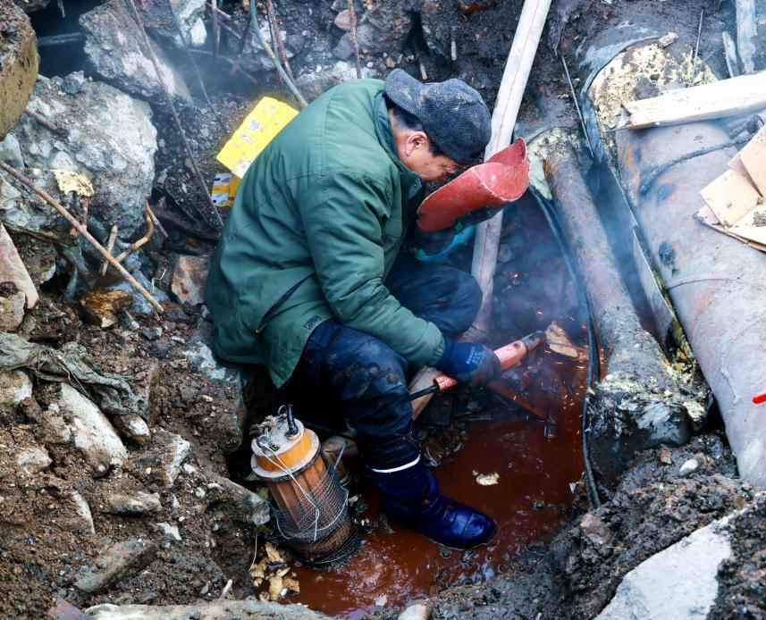 搶修現(xiàn)場,機械與人力協(xié)同發(fā)力。小型挖掘機破土作業(yè),挖開近2米深的作業(yè)面,精準定位蒙板漏水點。10余名搶修人員腳穿水靴,一邊操作水泵排水,一邊用鍬鎬擴大作業(yè)空間,爭分奪秒推進搶修進程。為搶抓進度,搶修人員放棄午休和周日休息,全程堅守一線,先后完成開口、安裝臨時閥門等關(guān)鍵工序,待供暖主管水凈后,迅速開展焊接作業(yè),精準修復(fù)10多公分長的破裂處,最終完成焊接、保溫及現(xiàn)場恢復(fù)工作。