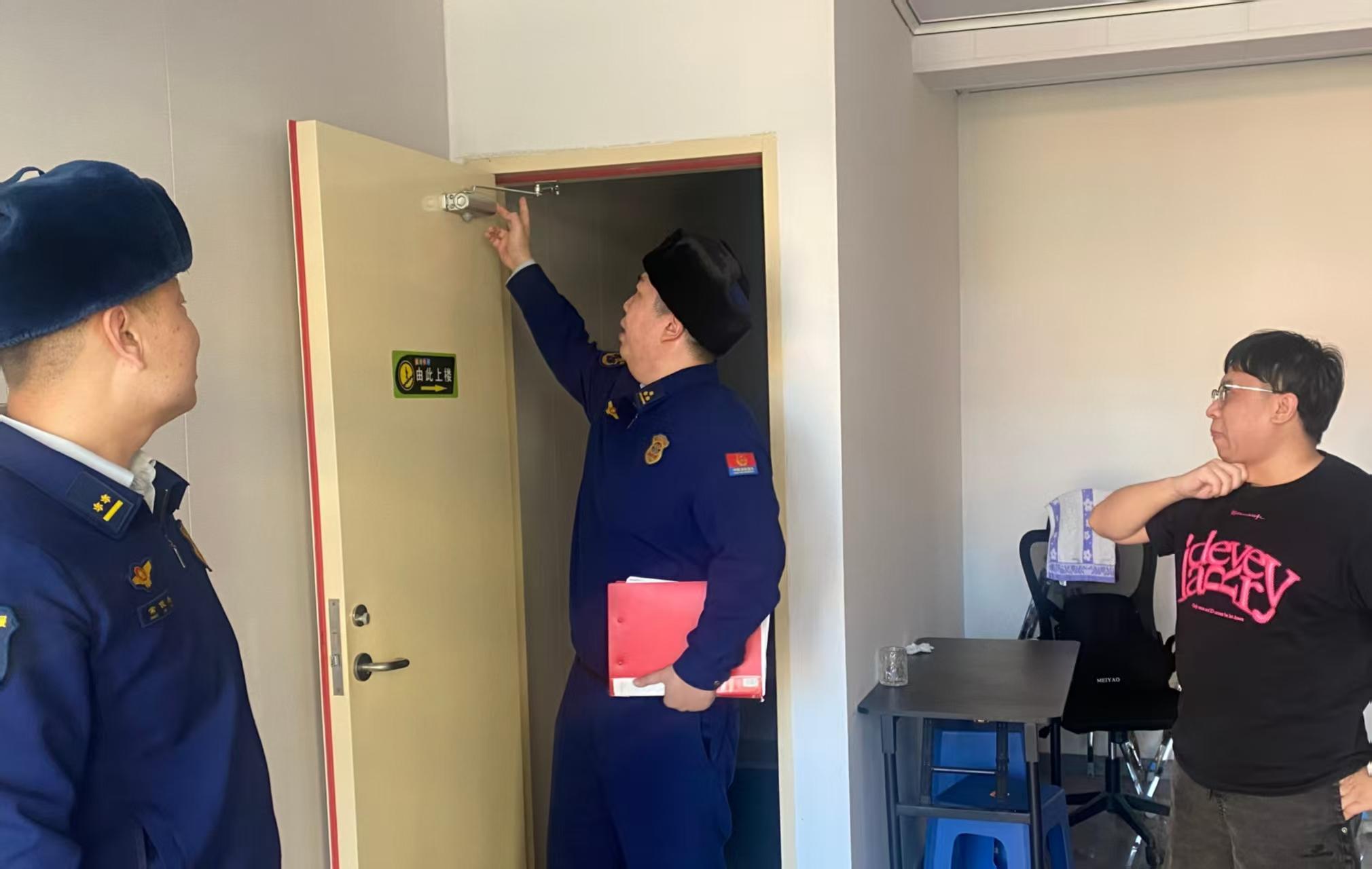 檢查組現(xiàn)場檢查防火門是否完好好用(胡春磊 攝)