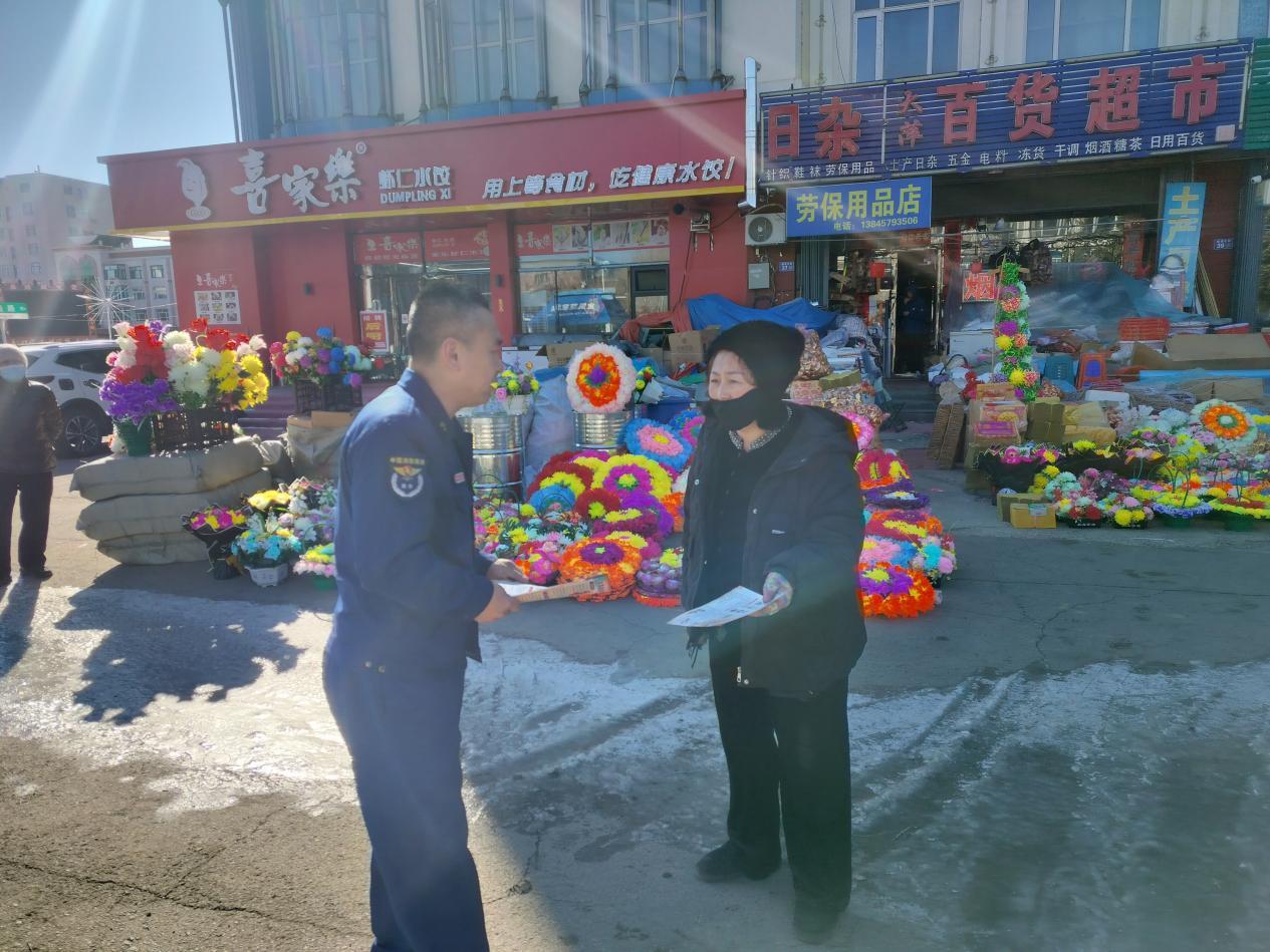 消防宣傳員提示商戶在銷售環(huán)節(jié)提倡文明祭掃的重要性(盧靜 攝)